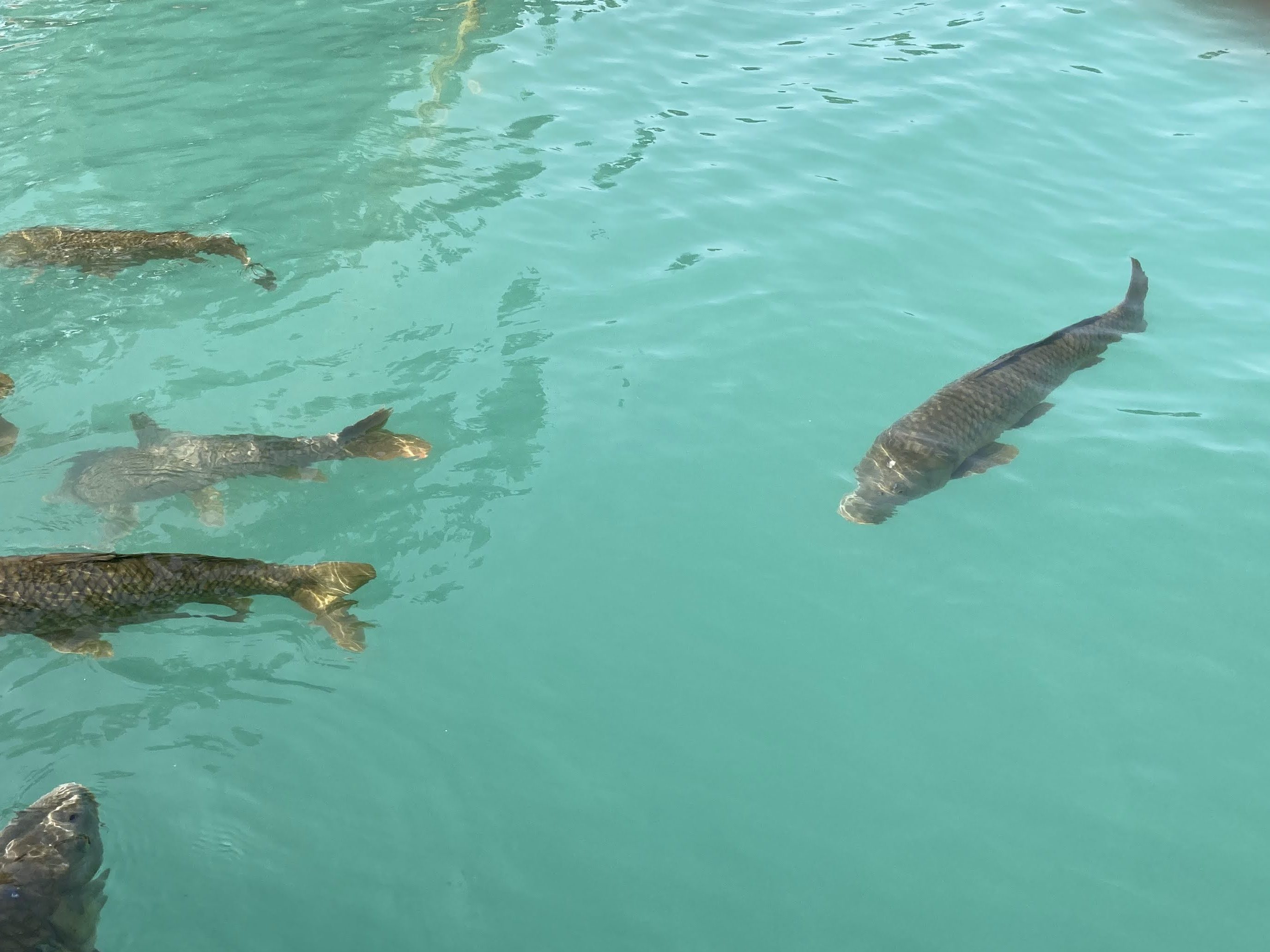 The lake is rich in fish. Carp are abundant and have become like family. We often see turtles in the morning warming up on the structures.